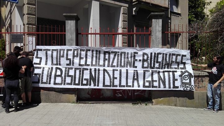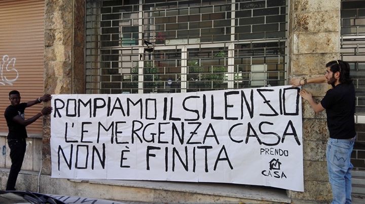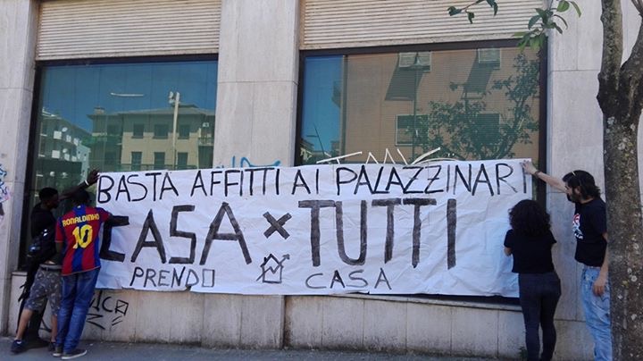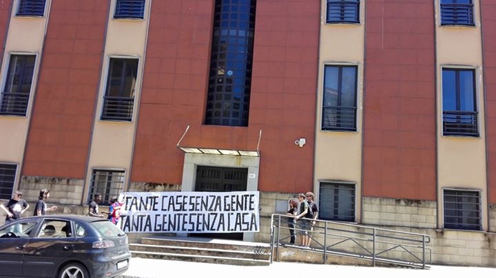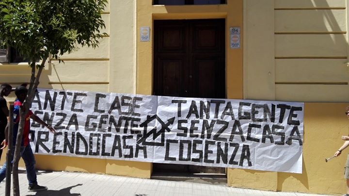 Prendocasa ha preso la parola, rompendo il silenzio pre-voto, attraverso le pratiche militanti che lo contraddistinguono e non limitandosi a sterili prese di posizioni su tastiera (facile dietro una scrivania additarsi come rivoluzionario super-micidiale senza aver mai messo le mani nella merda delle contraddizioni sociali), scendendo per le strade di Cosenza, fianco a fianco con i cosentini autoctoni e migranti che compongono il comitato di lotta, per ribadire con forza la sua incompatibilità con gli attuali schemi politici e la sua irrappresentabilità. La giornata di mobilitazione ha avuto inizio nel primo pomeriggio col sanzionamento simbolico di 5 palazzi del centro città. Palazzi pubblici e privati che potrebbero soddisfare il bisogno di un tetto per centinaia di persone e che invece vengono lasciati appositamente vuoti, (magari oggetto di speculazioni finanziarie) piuttosto che essere fittate a prezzi calmierati o requisiti dal comune, col chiaro intento, da un lato, di mantenere alto il canone degli affitti ai palazzinari, e dall’altro garantire le rendite agli amici che sull’emegenza abitativa hanno costruito intere fortune economiche.