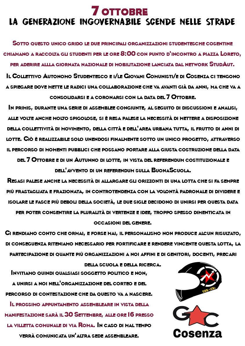 la giornata nazionale di mobilitazione lanciata dal network StudAut. Il Collettivo Autonomo Studentesco e i/le Giovani Comunisti/e di Cosenza ci tengono a spiegare dove mette le radici una collaborazione che va avanti già da anni, ma che va a consolidarsi e a coronarsi con la data del 7 Ottobre. In primis, durante una serie di assemblee congiunte, al seguito di discussioni e analisi, alle volte anche molto spigolose, si è resa palese la necessità di mettere a disposizione della collettività di movimento, della città e dell’area urbana tutta, il frutto di anni di lotte. Ciò è realizzabile solo unendosi finalmente sotto un unico progetto, attraverso il percorso di momenti pubblici che possano portare alla giusta costruzione della data del 7 Ottobre e di un Autunno di lotte, in vista del referendum costituzionale e dell’avvento di un referendum sulla BuonaScuola. Resasi palese anche la necessità di allargare gli orizzonti di una lotta che si fa sempre più frastagliata e frazionata, in controtendenza con la volontà padronale di dividere e isolare le fasce più deboli della società, le due sigle decidono di unirsi per questa data per poter consentire la pluralità di vertenze e idee, troppo spesso dimenticata in occasioni del genere. Ci rendiamo conto che ormai, e forse mai, il personalismo non produce alcun risultato, di conseguenza riteniamo necessario per fortificare e rendere vincente questa lotta, la partecipazione di quante più organizzazioni a noi affini e di genitori, docenti, precari della scuola e della ricerca. Invitiamo quindi qualsiasi soggetto politico e non, a unirsi a noi nell’organizzazione del corteo e del percorso di contestazione che da questo va a nascere. Il prossimo appuntamento assembleare in vista della manifestazione sarà il 30 Settembre, alle ore 16 presso la villetta comunale di via Roma. In caso di mal tempo verrà comunicata un’altra sede assembleare.