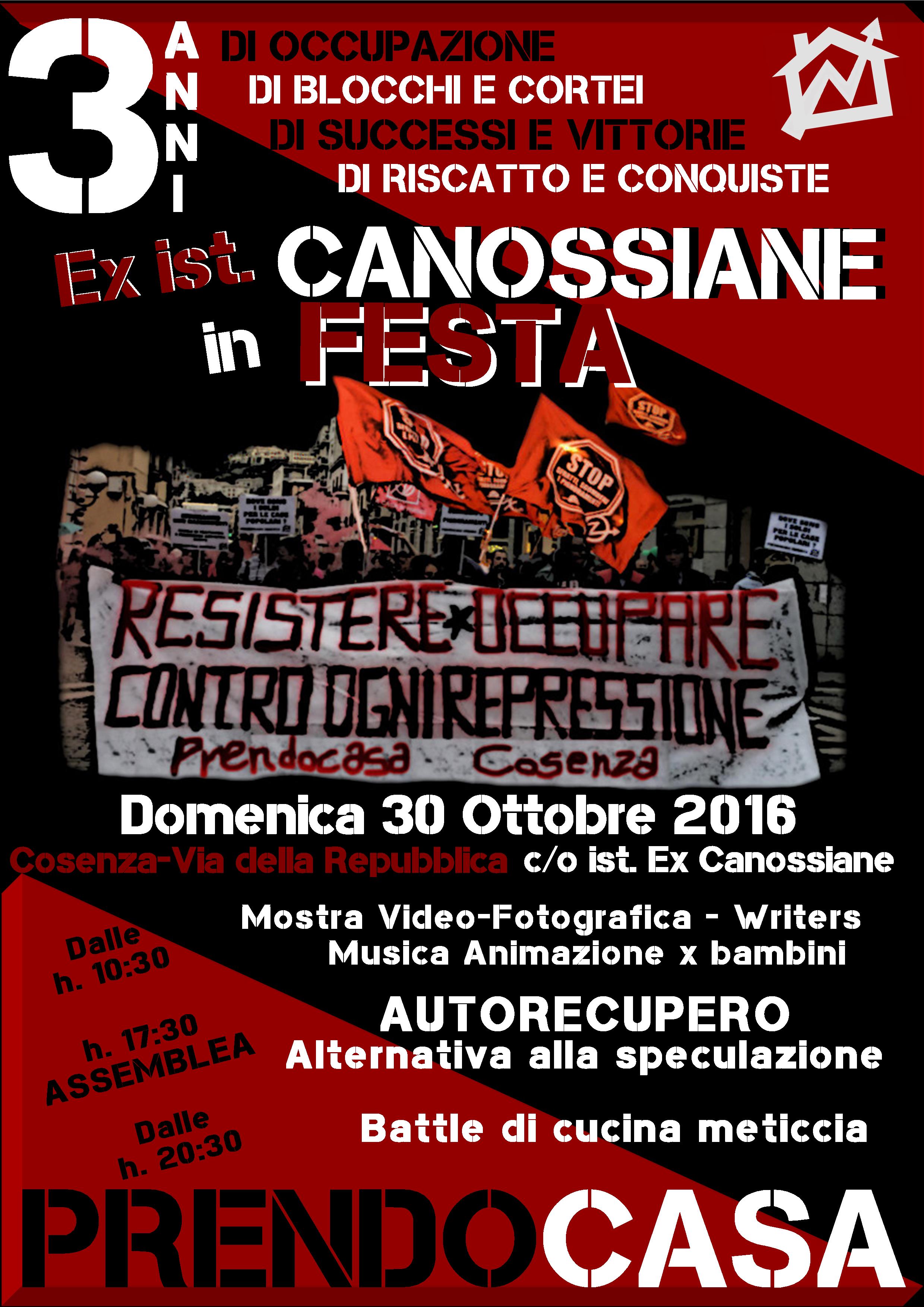 Domenica prossima, 30 ottobre 2016 vogliamo festeggiare con la città i primi 3 anni di occupazione dell’istituto delle canossiane, ripercorrere la storia della mobilitazione, non per autocelebrarci, ma perchè la narrazione possa, tra le altre cose, essere innesco di un meccanismo di riproduzione e riproducibilità tra le masse popolari e i settori sociali più deboli. Perchè chi oggi vive questo dramma, quello di non avere dove abitare, dove credcere i propri figli, dove costruirsi un futuro, possa prendere esempio dagli uomini e dalle donne che hanno animato le mobilitazioni cosentine di lotta x la casa degli ultimi anni (occupazioni delle ex canossiane e di portapiana) e con la propria tenacia ed abnegazione hanno scippato un diritto per lungo tempo loro negato.