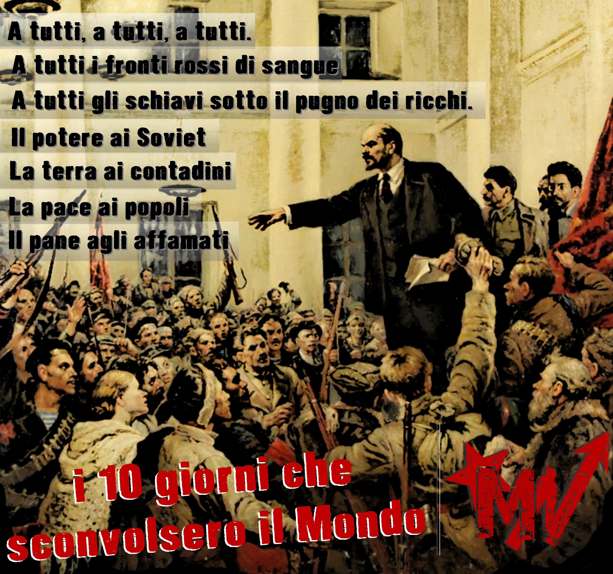 Quello che segue è un brano di grande rilevanza ed attualità che descrivevil grande fermento sociale politico e culturale vissuto in Russia in quei mesi con una tale grandezza e forza quasi da condurre il lettore nelle vie di Mosca o Pietrogrado nelle ore della presa del palazzo d’inverno, nei capannelli spontanei che sorgevano in ogni piazza e strada che vedevano coinvolti soldati e studenti, operai e semplici passanti a discutere della guerra, dello zarismo, dei proclami rivoluzionari dei bolscevichi. Ma la grandezza del brano sta anche nel descrivere la presa che le parole d’ordine leniniane, pane, pace e tutto il potere ai soviet, ebbero sulle masse popolari (soldati, operai e contadini) tali da porre un ristretto gruppo di rivoluzionari alla guida del primo governo operaio della storia.