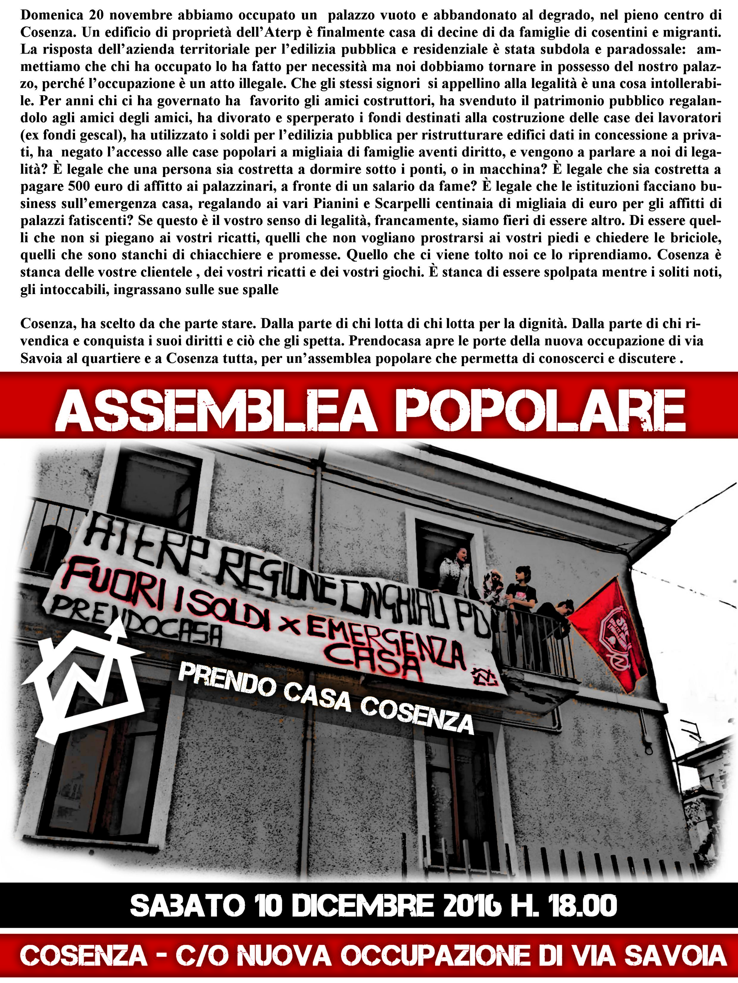Domenica 20 novembre un palazzo tristemente vuoto e abbandonato all’incuria, nel pieno centro di Cosenza, ha ripreso vita. A due passi dalla storica villetta di via Roma, all’angolo tra via Savoia e via Cattaneo, un edificio di proprietà dell’Aterp è stato occupato da famiglie di cosentini e migranti. Già, l’Aterp, l’azienda territoriale che dovrebbe pre-occuparsi dell’edilizia pubblica. Chi dovrebbe dare e distribuire secondo criteri di giustizia ed equità sociale, invece, colpevolmente, lascia che uno stabile di sua proprietà venga sommerso dalle erbacce e fatto oggetto di atti vandalici e razzie. Un palazzo che avrebbe dovuto ospitare i nuovi uffici dell’azienda ma che, si stenta quasi a crederlo, dopo pochissimo tempo, si è rivelato troppo piccolo per accogliere tutti i dipendenti. La sceneggiatura è sempre la stessa, vista e rivista. Si spendono impunemente soldi pubblici, si costruisce senza criterio, si sperpera, poi si affida ai privati per cercare di racimolare qualche euro, mentre 1200 famiglie, da anni iscritte nella liste per l’assegnazione di un alloggio popolare, aspettano ancora un tetto sulla testa. Lo abbiamo scritto, detto e gridato per le strade: “se le case non ce le date voi, ce le riprendiamo noi”. E di case, attorno alla nuova occupazione di via Savoia, ce ne sono veramente tante, le case di un quartiere popoloso che si è immediatamente mostrato caldo e accogliente nei confronti della nuova occupazione, portando solidarietà, mettendo a disposizione le proprie competenze, offrendo il proprio sostegno sincero e spontaneo. Sono diverse le occupazioni abitative che, in questi ultimi anni, puntellano la città di Cosenza: piccole sfere di resistenza allo spietato regime della speculazione degli im-prenditori locali, forme di auto-organizzazione che si oppongono ai crudi interessi di politicanti e malavitosi. Da corpi estranei, alieni, le occupazioni abitative sono diventate, con il trascorrere dei mesi, parti attive di una città che si è sempre ispirata ai principi della solidarietà e della cooperazione. Per questo, chi miseramente si appella, invece, ai principi della legalità e della sicurezza, evidentemente, vive un’altra Cosenza, la Cosenza della paura, del compromesso, dell’arrivismo, del malaffare, la Cosenza che abbandona i suoi figli e ghettizza i suoi fratelli. Per fortuna, però, si tratta di una Cosenza marginale, questa sì, una Cosenza che vogliamo mettere definitivamente a tacere. Non siamo più disposti a cedere agli squallidi ricatti di omuncoli in giacca e cravatta. E la città, quella vera, quella che i suoi figli e i suoi fratelli li tutela e protegge, lo sta cominciando a capire. Illegale non è chi recupera, rivitalizza, sottrae al degrado per dare un tetto sulla testa ai propri bambini, ma chi specula, devasta i territori, cementifica selvaggiamente, chi costruisce per riciclare, regala immobili, raccatta appalti, fa scomparire milioni di euro destinati all’edilizia popolare con la disinvoltura del migliore Houdini. Di maghi, però, noi non ne vogliamo. Siamo abituati a giocare a carte scoperte, noi, mettendoci la faccia, ogni giorno. I prestigiatori li rispediamo volentieri ad allietare le patinate serate dei salotti buoni della Cosenza che conta…pacchi e mazzi di soldi. Gli spacciatori di illusioni e false promesse sono il vero cancro della nostra società. Da estirpare, subito, alimentando e diffondendo a macchia d’olio le pratiche politiche che si costruiscono dal basso, quelle pratiche che rivendicano il diritto alla casa, come quello alla salute, al reddito, alla dignità della persona.