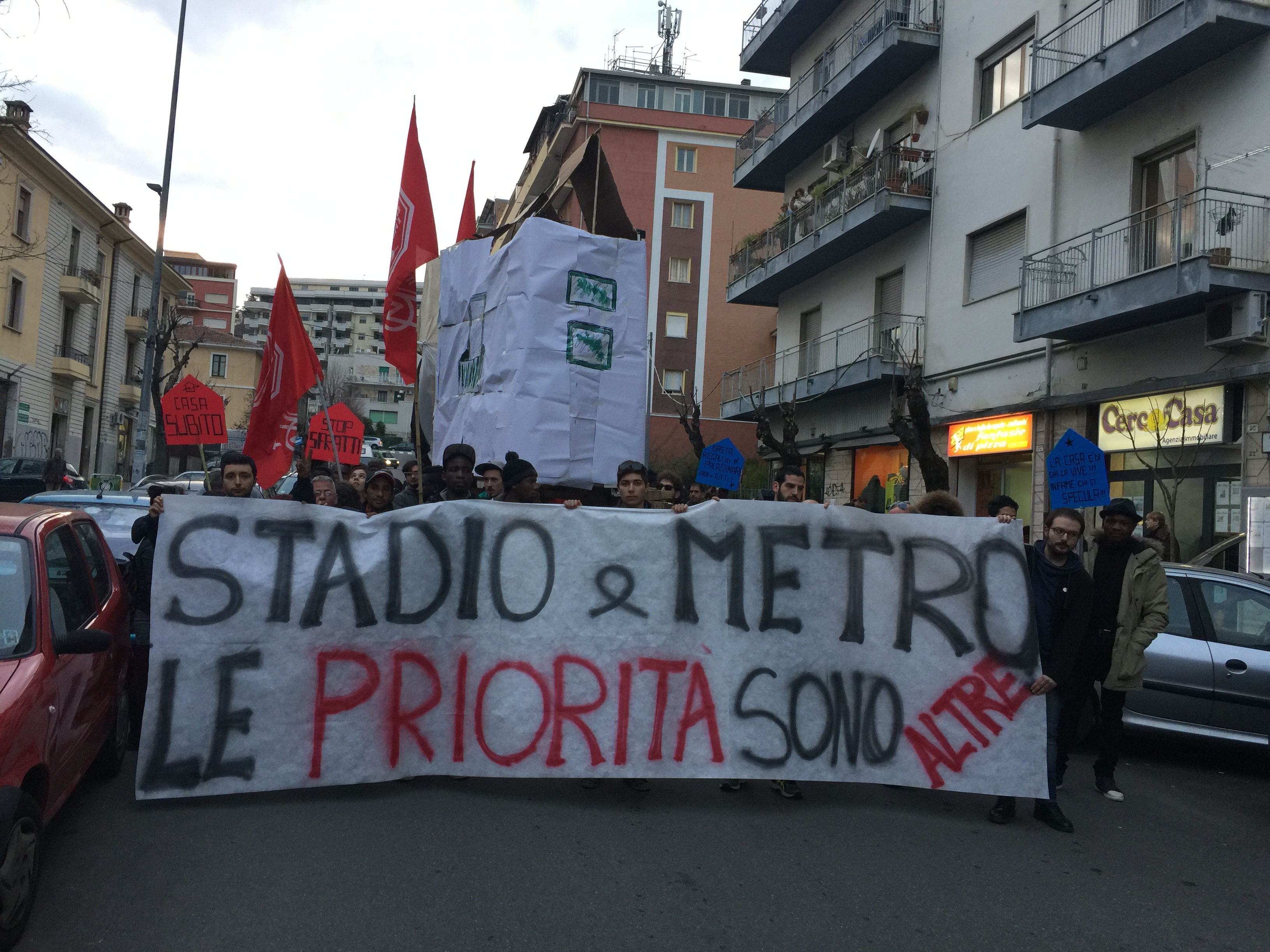 Per questo, abbiamo deciso di portare in corteo, con noi, una piccola casa, e collocarla simbolicamente al centro della nuova Piazza Bilotti, per ribadire che le priorità di questo territorio non sono uno stadio avveniristico o la metropolitana leggera, ma casa, reddito e salute, diritti necessari per una vita degna.