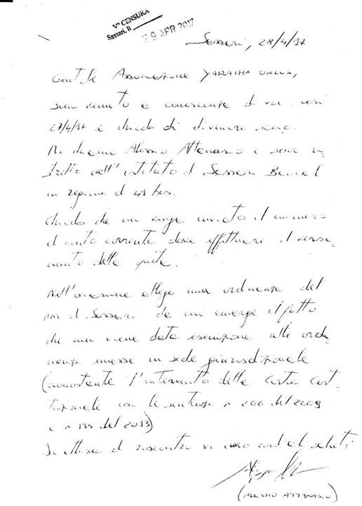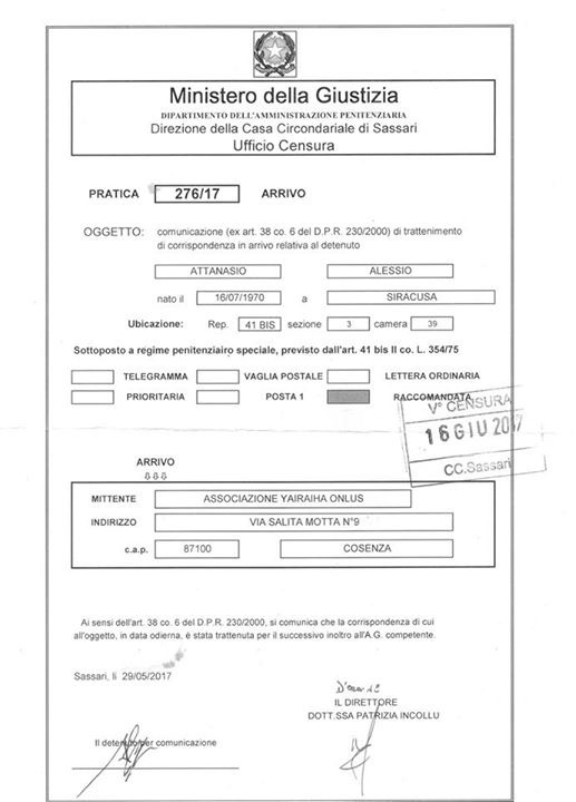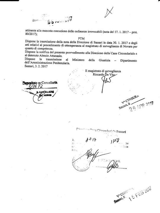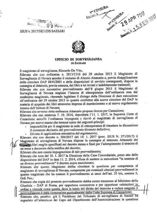 Lo scorso maggio abbiamo ricevuto una lettera da parte di Alessio Attanasio, attualmente detenuto a Sassari in regime di 41bis ma “turista” delle analoghe famigerate sezioni di Terni, Novara, Milano Opera, in cui ci chiedeva come fare per aderire alla nostra associazione ed allegava una ordinanza del Magistrato di Sorveglianza di Sassari, dott. Riccardo de Vito, relativa alla mancata esecuzione di un’ordinanza del Magistrato di sorveglianza di Novara del 2013 con cui si disponeva la consegna di alcuni libri al ricorrente, ordinanza che venne poi disattesa dalla direzione della cc di Novara perché nel frattempo era entrata in vigore una nuova disposizione del DAP e, lo stesso Magistrato di sorveglianza di Novara, nel 2015, revoca la disposizione precedente dando ragione alla direzione di Novara. A questa altalena di ordinanze il sig. Attanasio ricorre per Cassazione e quest’ultima gli da ragione perché le leggi e le disposizioni, si sa, non possono essere retroattive.