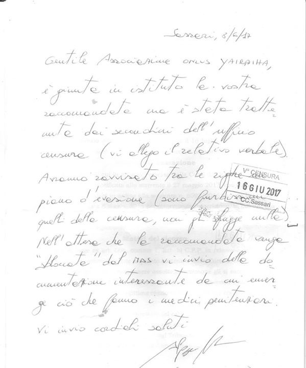 lettera e documenti (vari articoli di giornale che verranno censurati e trattenuti dalla direzione della cc di Sassari, come si evince dalla lettera successiva, datata 8 giugno e recapitata il 14 agosto. In quest’ultima allega altra documentazione interessante come l’ordinanza 4660/2013 emessa dall’ufficio di sorveglianza di Novara che attesta gli abusi che vengono commessi nelle sezioni del 41bis, andando oltre le disposizioni già di per sé altamente punitive, durante il cd “isolamento disciplinare”: chiusura del blindo h24 nonostante le valutazioni mediche che prescrivevano l’esatto contrario e nonostante anche il regolamento penitenziario stesso vieti la chiusura del blindo se non “limitatamente al tempo necessario per consentire il passaggio degli altri detenuti”, la limitazione tout court della ricezione di pacchi postali, la limitazione del vitto a quello ordinario e la limitazione dell’acqua che, in questo caso,viene addirittura fatto divieto di tenere la bottiglia in cella e viene posta fuori e somministrata dal personale al solo passaggio della terapia!, il divieto assoluto di eseguire l’isolamento disciplinare in sezioni diverse da quelle ordinarie e di protrarlo per più di 15 giorni o di far scontare più provvedimenti disciplinate di seguito.