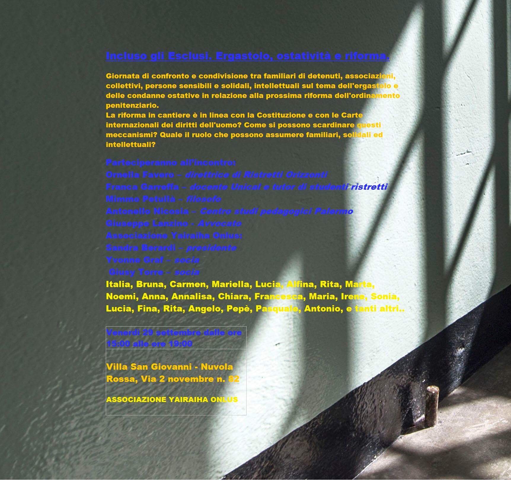 Giornata di incontro e dialogo tra familiari di detenuti, associazioni, collettivi, persone sensibili e solidali, intellettuali sul tema dell’ergastolo e delle condanne ostative in relazione alla prossima riforma dell’ordinamento penitenziario. La riforma in cantiere è in linea con la Costituzione e con le Carte internazionali dei diritti dell’uomo? Come si possono scardinare questi meccanismi? Quale il ruolo che possono assumere i familiari, solidali ed intellettuali?